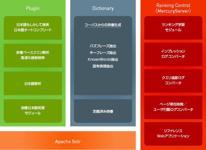 ・クリックログ等のユーザー行動履歴からクリックモデルを作成し、機械学習によりApache Solrのランキングがより適切になるように自動チューニングする機能