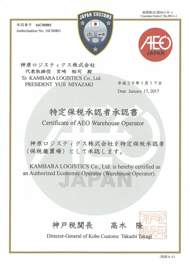 神原ロジスティクス株式会社(本社:広島県福山市箕沖町109番5、代表取締役社長:宮﨑裕司)は、2017年1月17日付で、神戸税関長よりAEO制度に基づく「特定保税承認者」及び「認定通関業者」として承認・認定を受け、同25日に神戸税関にて認定書交付式が行われました。