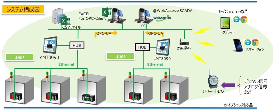 最初は特定工程の稼働監視からはじめ、設定追加で複数台の設備監視も実現できます。上位システムとの接続も、Industry 4.0で標準とされているOPC UAに対応するなど拡張性も兼ね備えており、大規模システムにも展開が可能です。オプションで、取得したデータをデータベース化するプランもご用意しています。