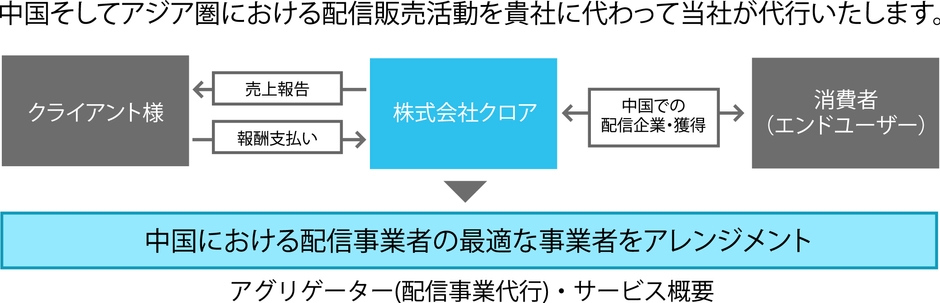 株式会社クロアは、日本レコード協会(RIAJ)の準会員であること、およびヒーリング音楽マーケットにおいて日本国内トップクラスのシェアを有することを活かし、クロアが開発保有する「ヒーリングコンテンツ及び音楽」を中国BGMサービス市場において普及、拡大することを目指します。なお、中国配信市場向けの「アグリゲーター(配信事業代行)」につきましても、日本国内のレコード会社、音楽レーベル、芸能プロダクション、ゲーム会社、映画会社向けにサービスを開始しています。中国市場への販売展開、ローカライズ、配信、運営、マーケティングなど、中国市場への販売展開をご希望の方は、株式会社クロアのお問い合わせ窓口までご連絡ください。