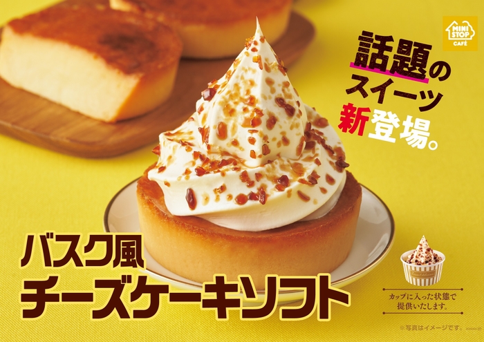 濃厚でコク深い、リッチな味わいが特長のチーズケーキにソフトクリームバニラを乗せて、さらにローストシュガーをトッピングしたミニストップならではの“バスク風チーズケーキソフト”です。