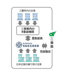 また、本包括協定をもとに、三重県に本店を置き、三重県事業承継ネットワークに加入する全金融機関8行庫(百五銀行、三重銀行、第三銀行、桑名信用金庫、北伊勢上野信用金庫、津信用金庫、三重信用金庫、紀北信用金庫(※2))とビズリーチは業務提携し、事業承継M&Aプラットフォーム「ビズリーチ・サクシード」の周知および利用を通じた事業承継の円滑化を図ります。このように自治体と民間企業が包括協定を結び、県内の全金融機関(※1)が同一のITプラットフォームを活用する事業承継支援モデルは日本初の取り組みとなります。本協定および本提携を通じて、企業オーナーに事業承継の選択肢を早期から提供することで、後継者難による廃業を阻止し、地域の活性化を目指します。