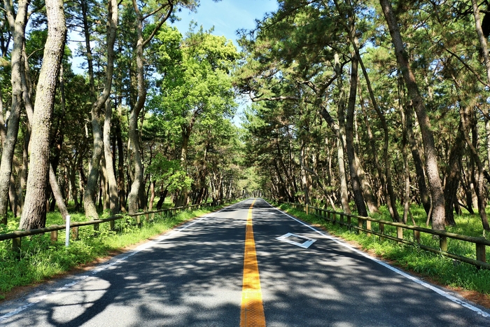 唐津湾の海浜に続く虹の松原(にじのまつばら)。国の特別名勝で、三保の松原(静岡県)、気比の松原(福井県)とともに日本三大松原のひとつに数えられる景勝地です。松に囲まれたまっすぐに伸びる道をオートバイで走るのは格別ですね。