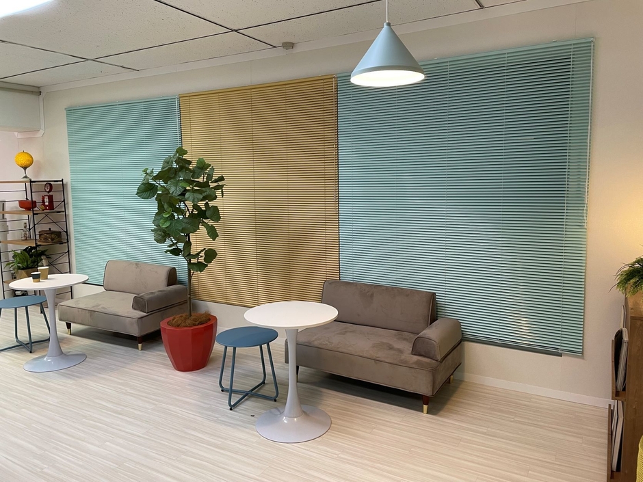 【主人公が勤めるデザイン会社のセット】アルミブラインド ベネアル25 TB-076(左右)、TB-112(中央)