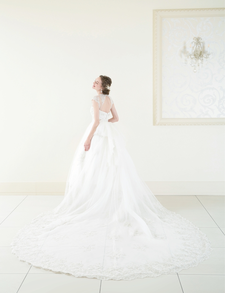 空気を含んだように柔らかで愛らしい、ナチュラルテイストな雰囲気溢れるドレス。ふんわりとしたシルエットを作り出すオーバースカートやリボン、ロングトレーンのアレンジ次第で花嫁様が思いのままにカスタマイズできる3way仕様の夢のような一着です。