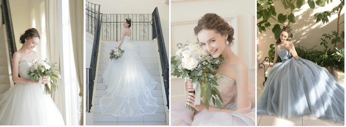 軽やかなソフトチュールとウエストのタッキングでふんわりと仕上げたシルエットが愛らしさ溢れるビックラインのドレス。胸元とスカートにはレースの刺繍やビジューを装飾することで女性らしい繊細さも表現しています。