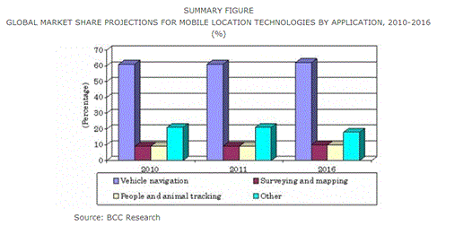 車両ナビゲーションシステム部門は、2010年に138億米ドル規模に達し、モバイル位置情報市場の61%以上の割合を占めました。 2011年には154億米ドル近くとなり、その後CAGR 8%で拡大し、2016年には226億米ドル近くに達する見通しです。