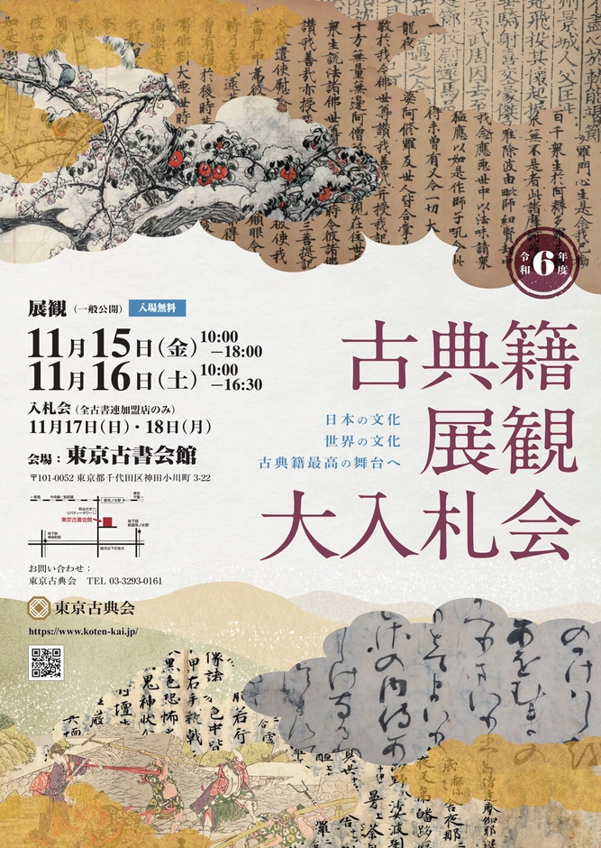 東京古典会は11月15日(金)と11月16日(土)の2日間「令和6年度 東京古典会 古典籍展観大入札会」にて一般公開を行います。