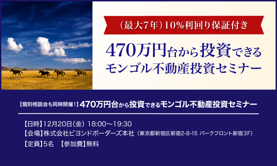 ビヨンドボーダーズが12月20日に500万円から投資が可能な 「モンゴル新物件セミナー」を開催、 利回り保証+100%買取保証付きの注目物件の魅力を紹介