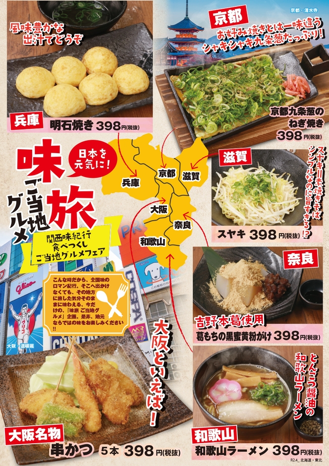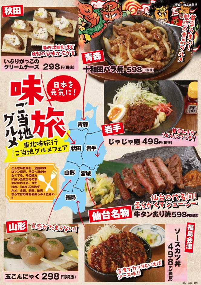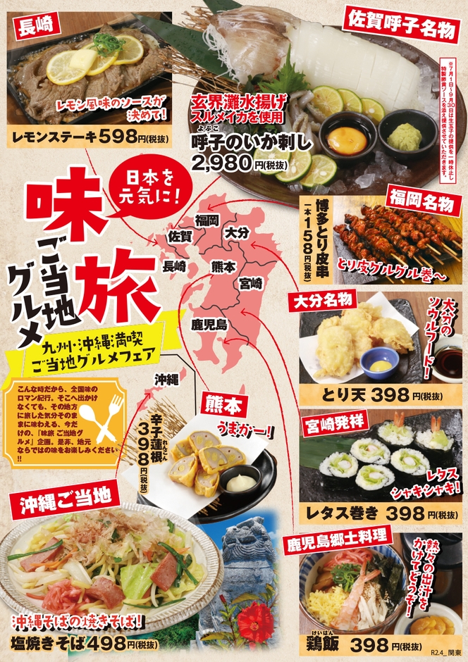 目利きの銀次・千年の宴・山内農場・白木屋・魚民・笑笑などで、 令和2年4月7日から、『味旅』ご当地メニューの期間限定販売