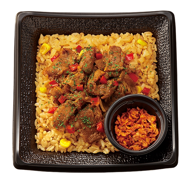 角切りカルビと焼肉のタレと混ぜ合わせ、ゴロゴロとした食べごたえのある具だくさんのおにぎりです。韓国のりフレークを振りかけることで牛角商品の「カルビ専用ごはん」をおにぎりで再現しました。