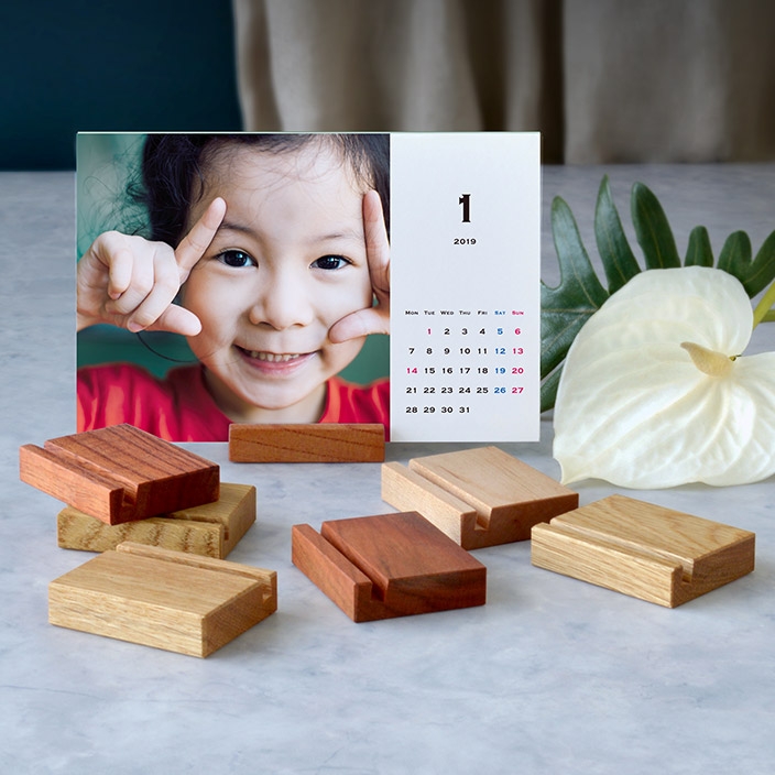 月表記の下にワンポイントで、2018年版は花のモチーフ、2019年版はハーブをあしらいました。付属の木製スタンドとの相性はバツグン!職場のデスクに置く癒しグッズとして提案します。