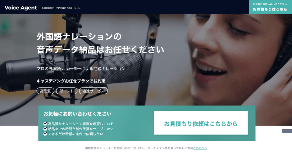 主に録音環境を持つ海外在住のプロナレーターを起用しているため、高品質でありながら、場所にとらわれない低価格のサービスを実現。
