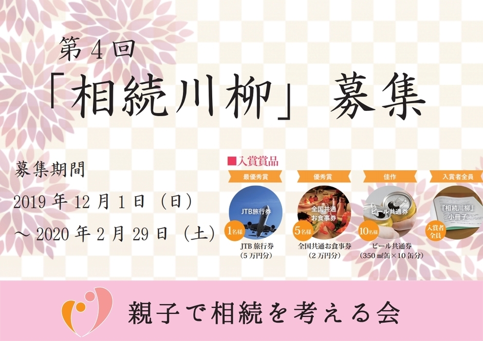 親子で相続を考えるきっかけを提供している「親子で相続を考える会」(事務局:東京都千代田区、プロサーチ株式会社内)では、第4回「相続川柳」を募集します!