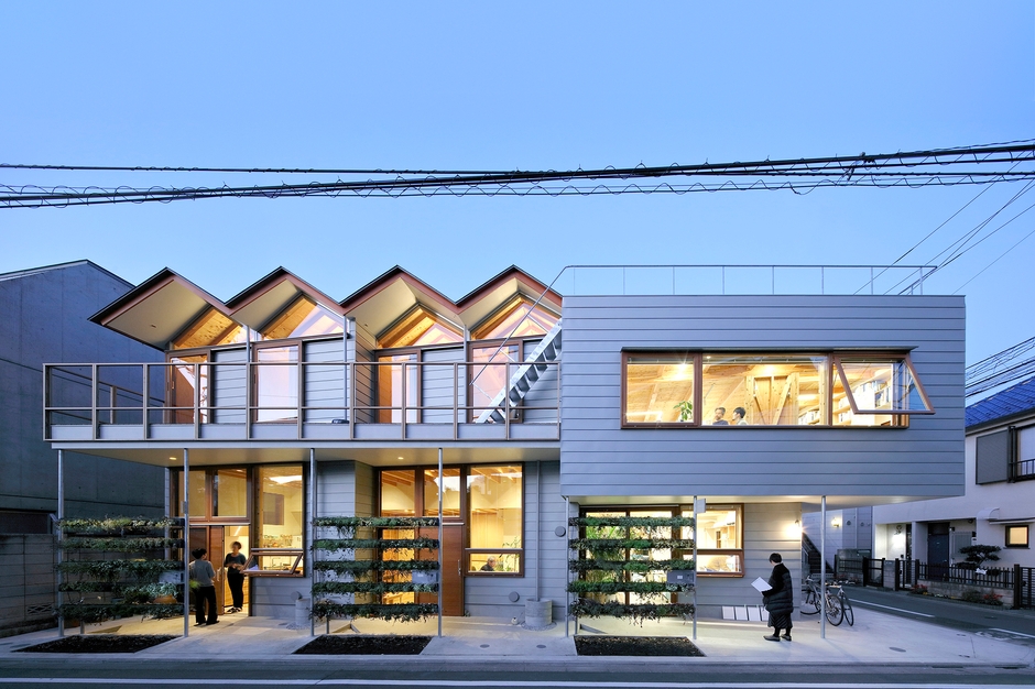 本作品は都内の低層住居専用地域に建つ、木造地上2階の集合住宅です。最大の特徴は住居と仕事場の併設により、他者との交流が生まれる開かれた住環境にあります。庇や1階軒下空間のグリーンルーバー、天水桶を用いた打ち水効果等、一年を通して快適な室内環境を保つ性能を備えています。審査では温熱環境や光環境といった基本性能に加え、中間領域がもたらす地域との関わりや、住居で暮らす家族と仕事場で働く人とが双方向で築く関係性、家族の成長に伴う変化や住戸性能のアップデートを受け入れる余白ある空間等、本作品が生み出す人と環境との豊かな関わり合いが評価され、グランプリに選定されました。
