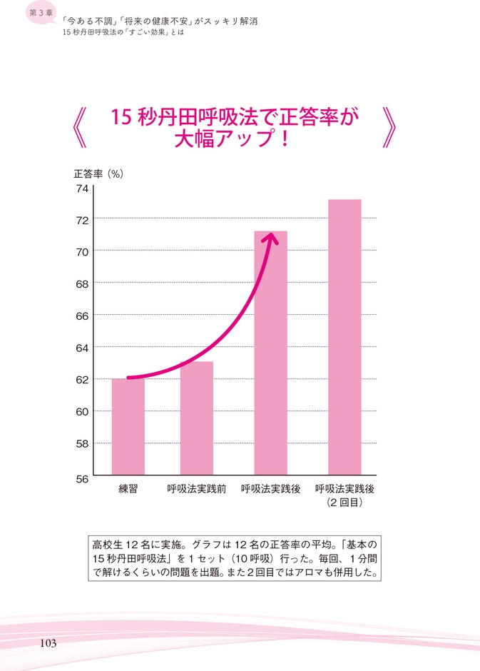 さらに、本書では、丹田呼吸の効果を高めるための「丹田フラダンス」や、肩こり、ひざ痛などの目的に合わせた「呼吸法ストレッチ」なども紹介。そして、実際に丹田呼吸法を体験した結果の喜びや驚きの声も掲載し、具体的にどんな効果があったのかなどを紹介しています。