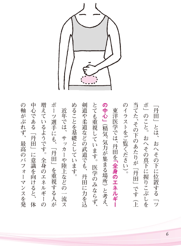 丹田とは、へその少し下腹の内部にあるツボで、武道でも気力が集まる体の要所とされています。ここを意識して深く呼吸し、体内に酸素をたっぷり取り入れることを「丹田呼吸」といいます。