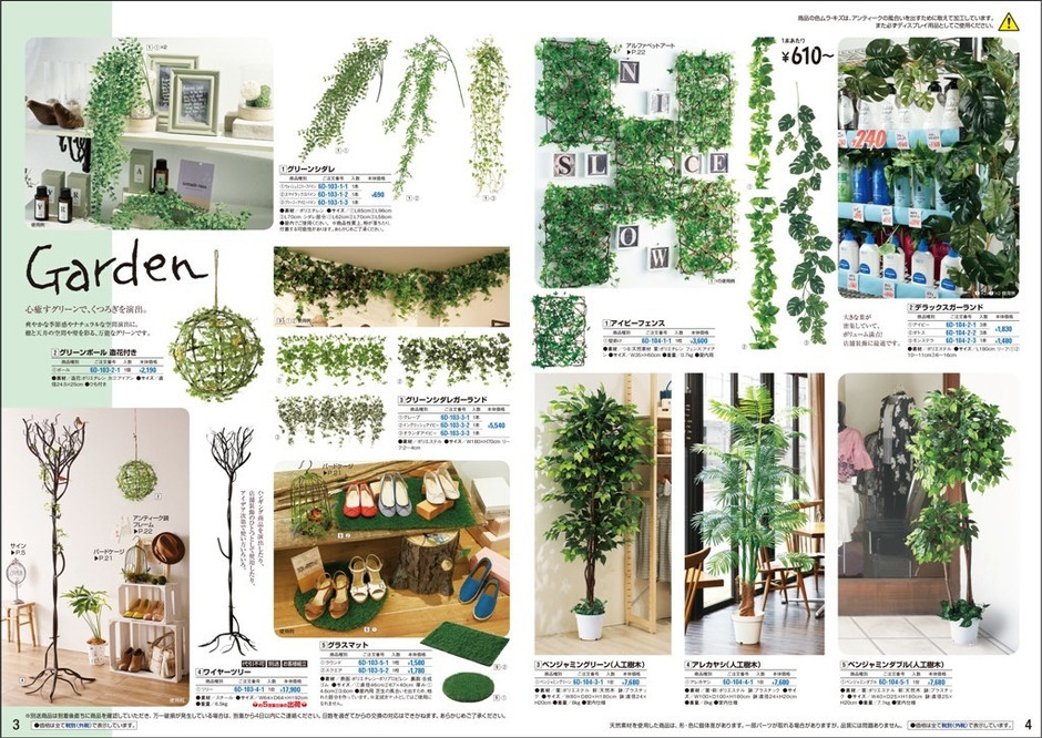 カタログでは、リース・立ち木などのグリーンアイテムや、木製オーナメント・アンティーククロック・ドール、エントランスを飾る個性豊かなマット・ボード・サインアイテムなどを多数掲載しています。またトレンドのインダストリアルテイストを取り入れたラック・サイドボード・壁掛け用サインボードや、シャビーシックイメージのチェスト・テーブル・ボレー・パーティション・テーブルが登場。アイアンのシェルフやスタンドなどの大型品、小物装飾も加わり、おしゃれなお店づくりにおすすめです。