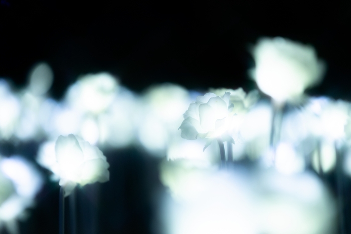 しばふ広場一面にひろがるのは、みろくの里が位置する広島県福山市を代表する花「バラ」のイルミネーション。暗闇で光る1万本の白いバラは、うっとりするほどの華やかさ。
