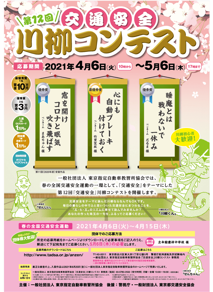 一般社団法人 東京指定自動車教習所協会(本部:東京都品川区、以下 東京指定自動車教習所協会)は、警視庁、一般財団法人 東京都交通安全協会の後援をいただき、2021年4月6日(火)より「春の全国交通安全運動」の一環として、交通安全にまつわることを詠んだ、第12回「交通安全」川柳コンテストを開催いたしますので、下記のとおりお知らせいたします。