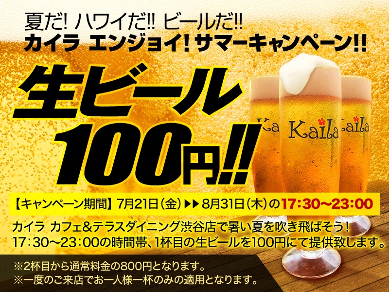 渋谷の真ん中にいながら、ハワイへトリップしたような雰囲気を味わっていただける、ハワイアンレストラン「カイラ カフェ&テラスダイニング渋谷店」では、梅雨明けで猛暑日が続く中、渋谷で涼とハワイを満喫していただくため、「夏だ!ハワイだ!!ビールだ!!カイラエンジョイ!サマーキャンペーン!!」を実施。2017年7月21日~8月31日の間、ディナータイム限定で、生ビールを1杯目なんと100円で提供いたします。