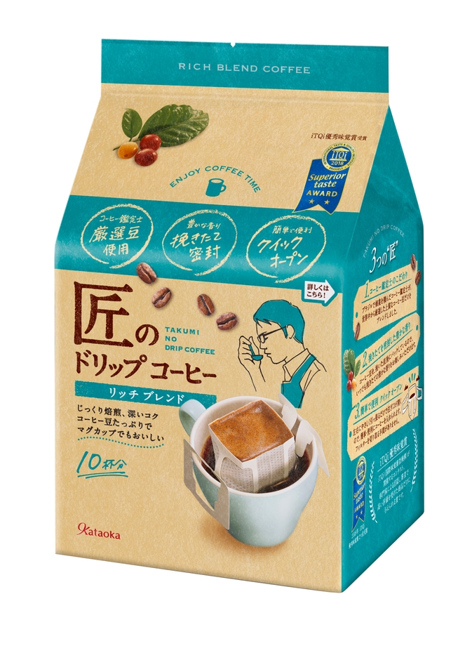 片岡物産株式会社(本社:東京都港区新橋、代表取締役社長 片岡謙治)は、ドリップコーヒーの新ブランド<匠のドリップ コーヒー>から「リッチ ブレンド(10袋入)」と「モカ ブレンド(10袋入)」を2019年2月19日(火)より全国のスーパー等にて発売しております。