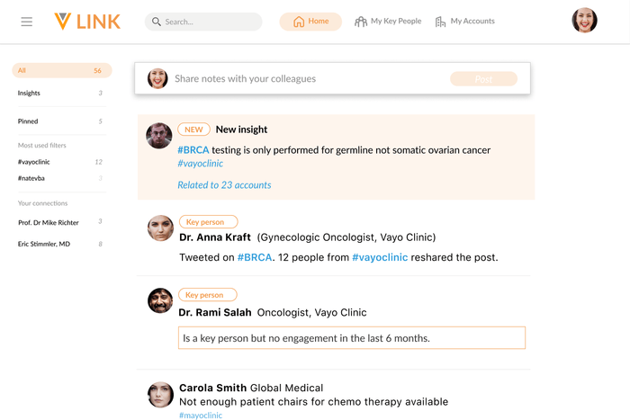通常、コマーシャルチームやメディカルチームは、複雑に絡み合ったステークホルダーからの重要顧客情報や、さまざまなチャネルからのデータをつなぎ合わせて全容を把握します。Veeva Link for KAMは、AIを利用して顧客のアクティビティや関係性に関するインサイトを統合することで、チームが適切な人物や意思決定者に素早くアプローチできるようにします。