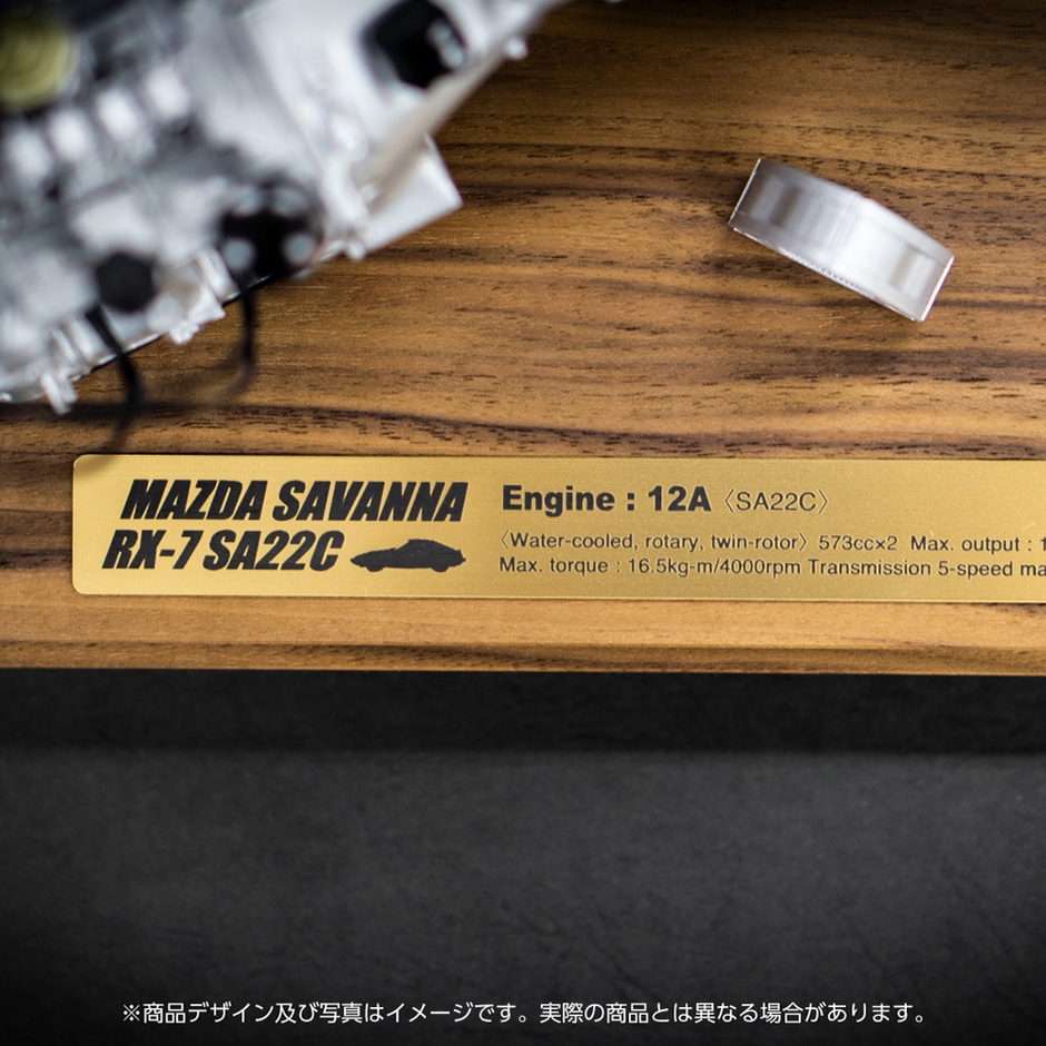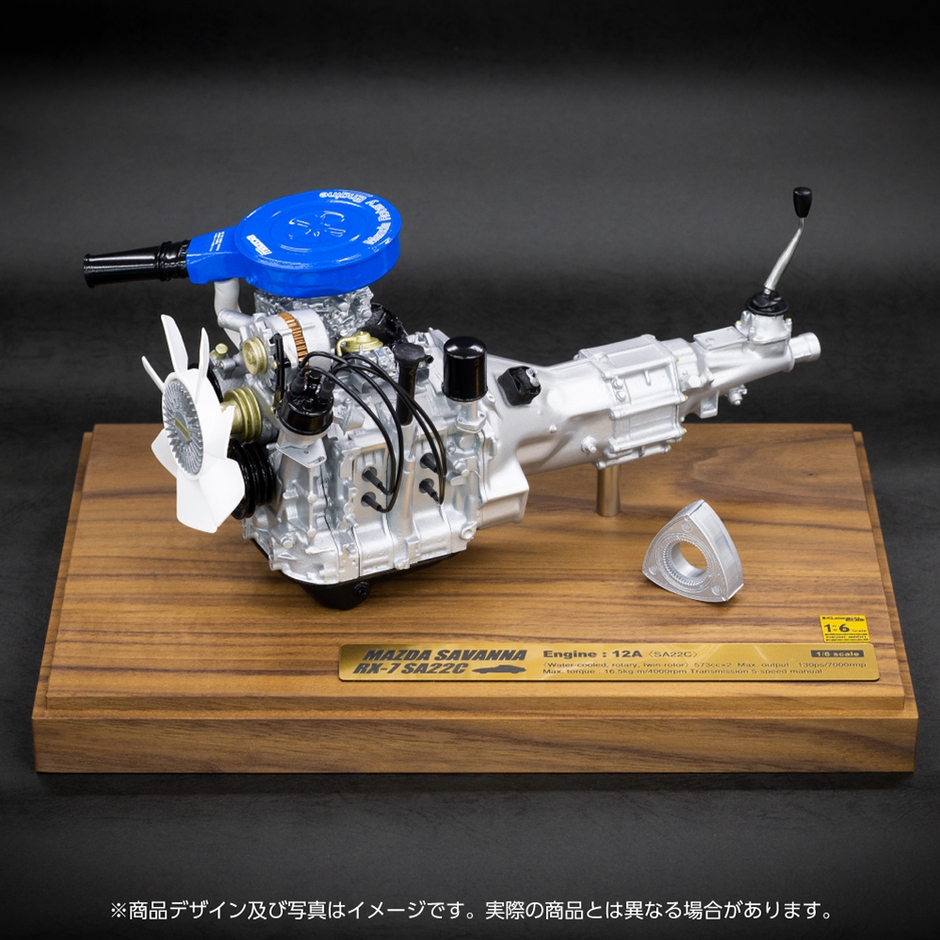 今回キャライフで販売開始となる商品は、世界で唯一、マツダだけが実用化に成功し⽇本が世界に誇る「ロータリーエンジン」を搭載した⽇本製スポーツカー「RX-7」の初代サバンナRX-7(SA22C)に搭載されていた12A型エンジンを1/6スケールでモデル化しました。