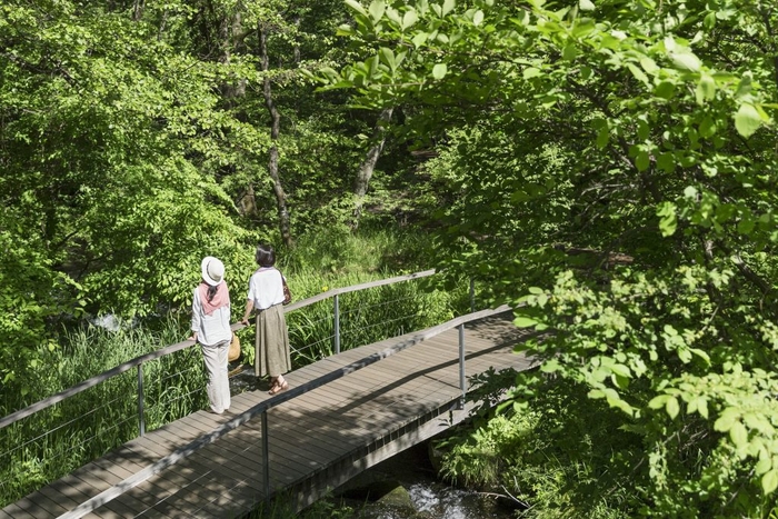 軽井沢星野エリアの各施設は、遊歩道でつながっています。湯上りには、渓流に沿って伸びる遊歩道をのんびりと散策するのがおすすめです。本プランの実施時期は軽井沢の早春から新緑の季節に当たり、春を迎えて躍動する森の生命力を感じることができます。