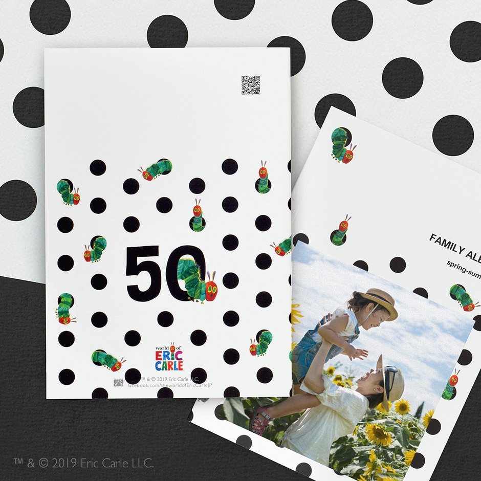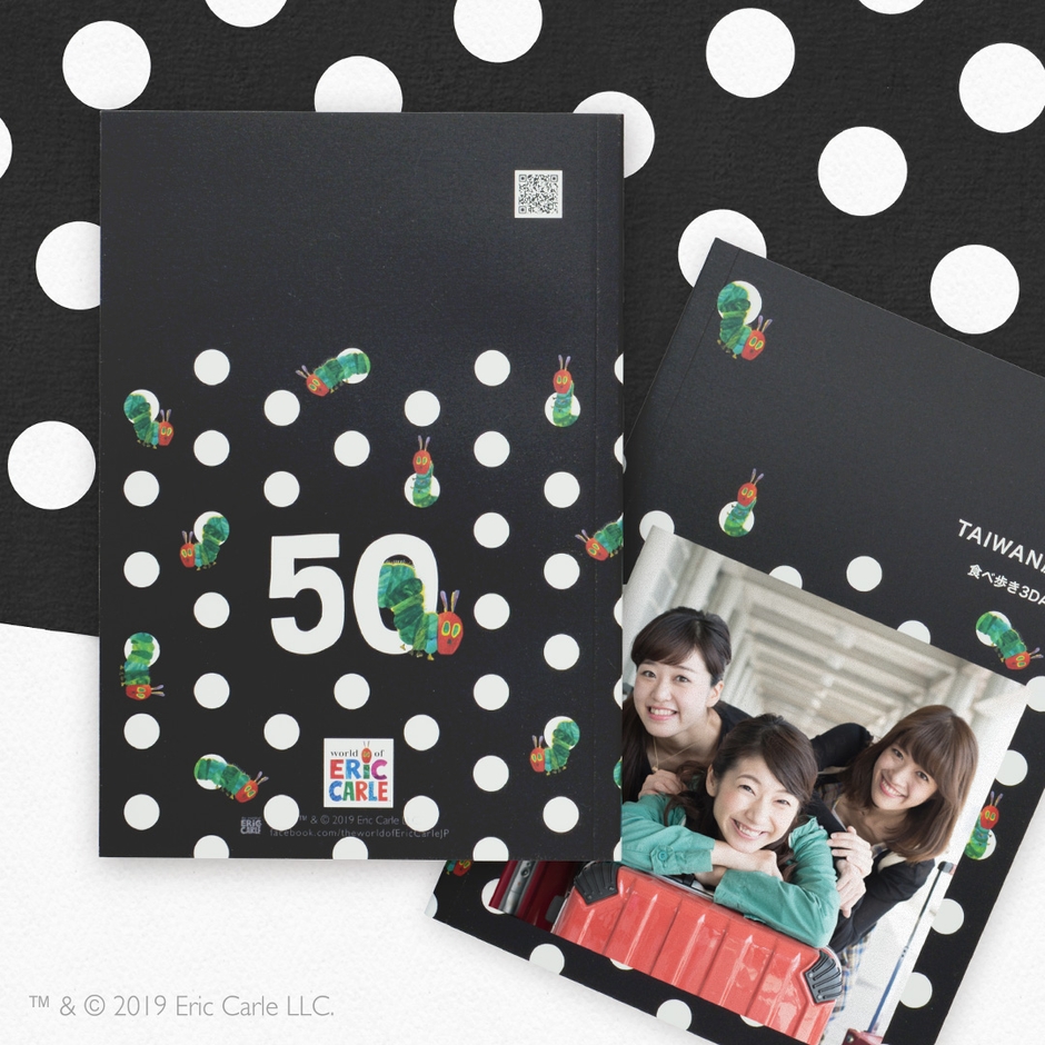 その縁もあり『はらぺこあおむし』50周年スペシャル企画に賛同。TOLOTのフォトブックに記念のロゴを使用した表紙を用意しました。従来のカラフルなデザインとは打って変わって、モノトーンの白と黒の2色で展開します。