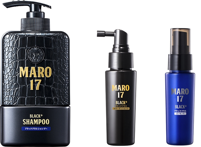 メンズエイジングケア(※1)ブランドMARO17シリーズからは、「ブラックプラス シャンプー」「ブラックプラス コラーゲンショット*」「ブラックプラス エッセンス」の3製品が発売予定です。