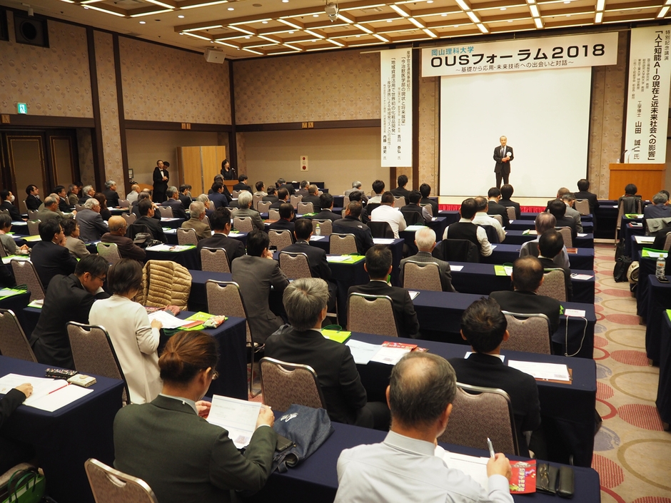 大学の研究シーズをベースに産学官の連携を推進していこうと岡山理科大学(岡山市北区理大町)は2018年11月26日、岡山市内のホテルで、「第18回OUSフォーラム」を開催しました。地元の会社経営者ら過去最多の約410人が訪れ、講演や教員によるポスター展示の説明に熱心に耳を傾けていました。