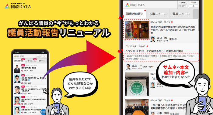 これまでは各議員の顔写真と報告タイトル、議員名のみが一覧で表示されていましたが、今回のアップデートにより、記事に関連するサムネイル画像と本文の一部が一覧上に追加され、「この議員は今こんな活動をしているんだ!」と、活動内容がより視覚的・直感的に伝えられるようになりました。