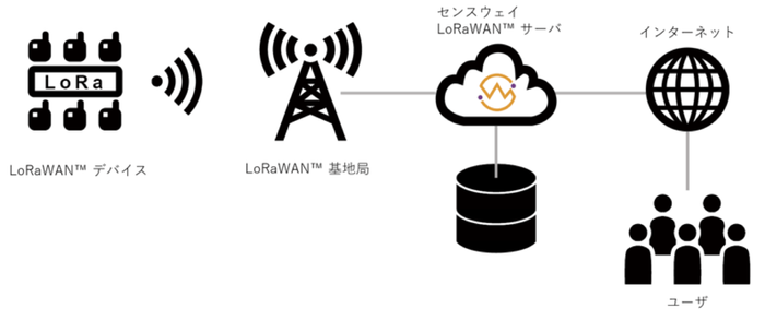 センスウェイのLoRaWANサービスはシンプルで、ユーザのLoRaWANデバイスは、全国に設置するLoRaWAN基地局(ゲートウェイ)を通して、LoRaWANサーバとIoTセンサーデータの双方向通信を行うことができます。