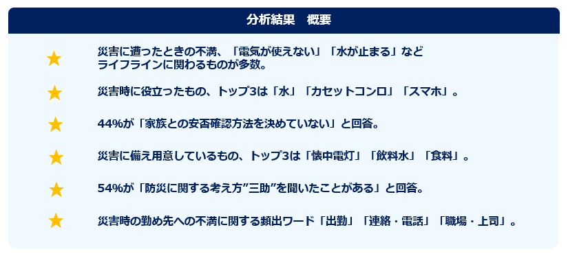 株式会社Insight Tech(本社:東京都新宿区、代表取締役社長:伊藤友博)が運営する「不満買取センター」上で、「防災」に該当するインサイトデータ1,500件を収集。解析ツール「ITAS」で解析を行ないました。以下、結果をご報告いたします。