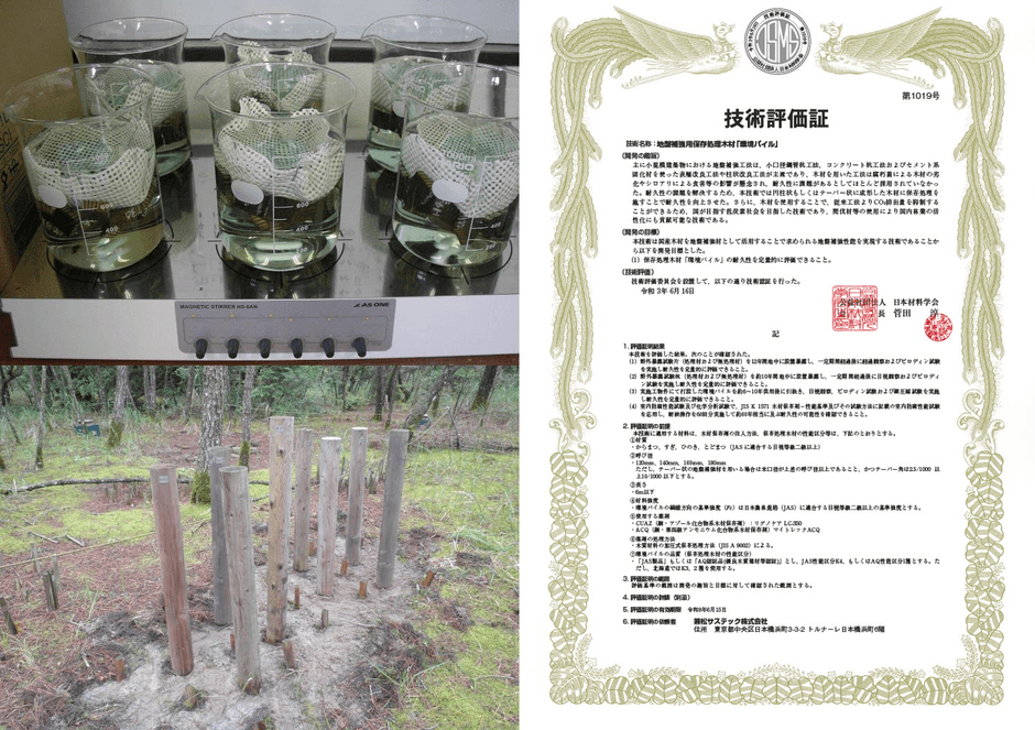 当社はこの耐久性の課題を解決するために、当社技術である木材保存処理技術を環境パイル(木材を利用した地盤補強材)に用いて耐久性を飛躍的に向上させその結果を第三者機関おいて証明を取得しました「木材の地中利用としては業界初」。