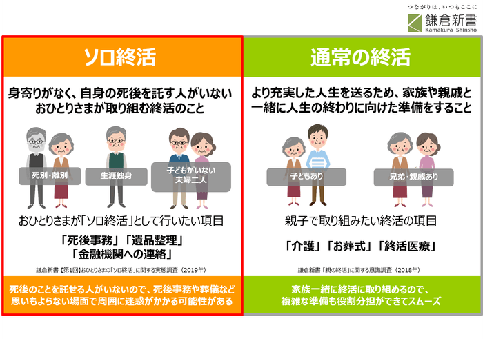 終活関連サービスを提供する株式会社 鎌倉新書(東京都中央区、代表取締役社長 清水 祐孝、証券コード:6184、以下 当社)は、2019年4月に『【第1回】おひとりさまの「ソロ終活」に関する実態調査(2019年)』を実施し、調査結果をまとめました。