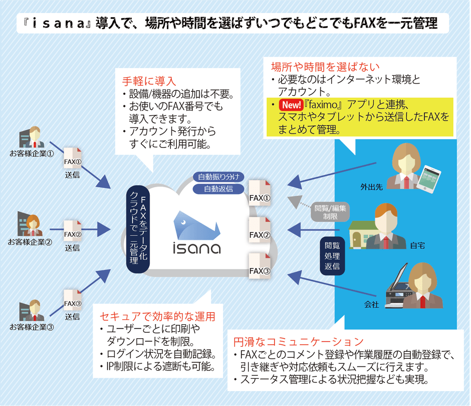 『isana』と『faximo』の連携機能を利用すれば、スマートフォン(スマホ)やタブレットから『faximo』アプリで送信したFAXを『isana』でまとめて管理可能となり、テレワークやBCP(事業継続計画)で求められる“オフィス以外の拠点からのFAX一元管理”が手軽に実現できます。