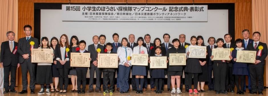 日本損害保険協会(会長:西澤 敬二)では、朝日新聞社と日本災害救援ボランティアネットワークとの共催で、第15回「小学生のぼうさい探検隊マップコンクール」記念式典・表彰式を開催しました。当日は、教育関係者や受賞団体の関係者などを中心に175名が参加しました。