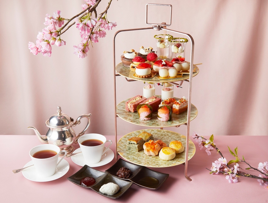 春の訪れを感じさせる優しい桜色を基調に旬の素材を贅沢に使用した桜アフタヌーンティーを、4月の1カ月間限定で提供いたします。セイボリーには、旬のホワイトアスパラガスとグリーンアスパラガスの色の対比が映えるスープや、贅沢な風味を引き出すトリュフ香る卵サンドイッチ、滑らかなムースの上に散らしたサクッとした旬の桜エビが食感のコントラストを生み出す海老のムース、塩気の効いた桜の葉がサーモンの風味を絶妙に引き立てるビーツでほんのりと色付けした手毬寿司がラインナップ。スイーツは、桜ペーストを乗せた和菓子定番の串団子、桜ジャムを中に包んだ桜味のマスカルポーネのムース、チェリークリーム入りのチェリーパイ、旬の文旦・みかん・いちごを使用したマチェドニア、ビターチョコレートで大人の味を演出したクレームブリュレが並びます。スコーンは、クラシックのほか、よもぎ味と桜の花びらをかたどった桜味をご用意。