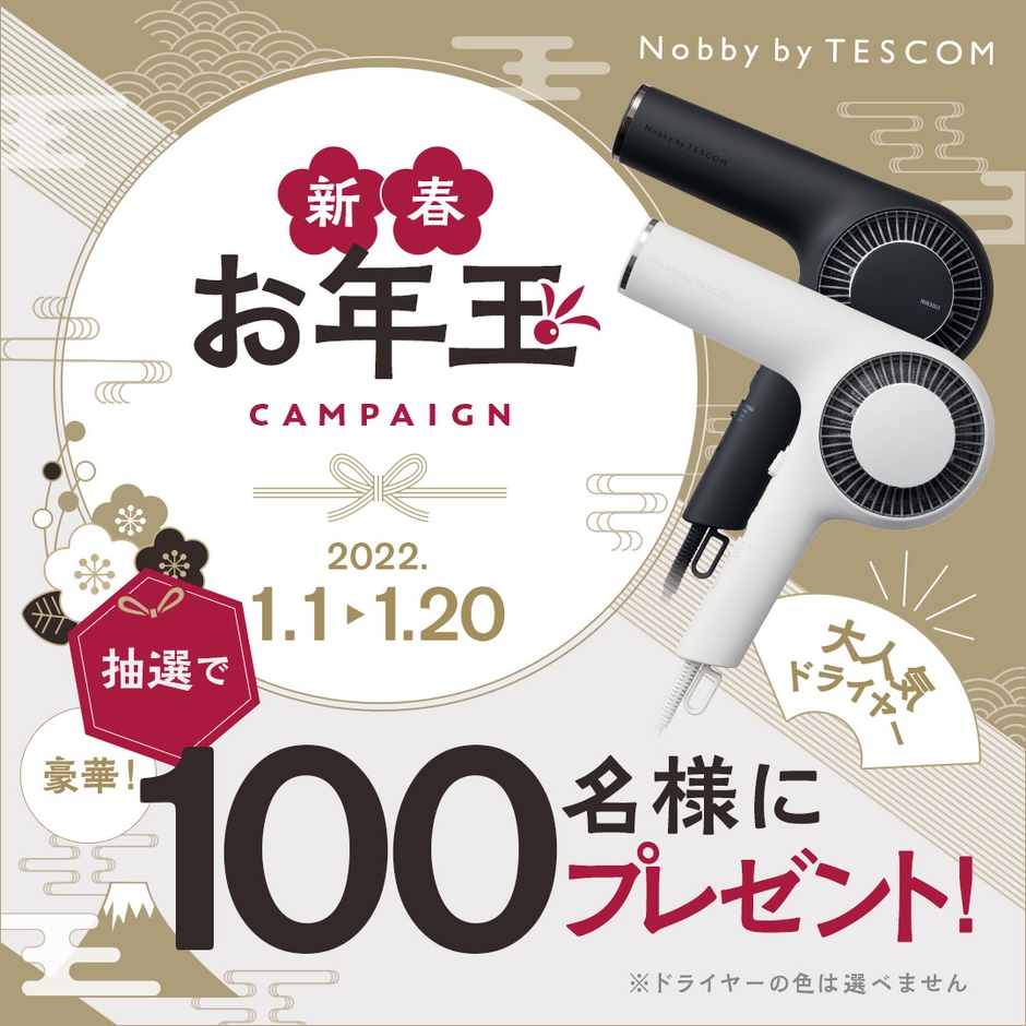 本キャンペーンでは、そのNobby by TESCOMの最上位機種であるプロフェッショナルプロテクトイオンヘアードライヤーNIB3001を新春お年玉企画として大奮発、当社SNSキャンペーン過去最大となる100名様にプレゼントいたします!