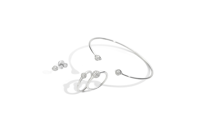 新しい「マーマ ノンマーマ」コレクションは、完璧なまでの白さに身を包み、ダイヤモンドの世界を追求してそのスピリットを体現します。ホワイトゴールドにホワイトダイヤモンドをあしらった新作のリング、スタッズイヤリング、バングルはコレクションをより洗練されたエレガンスへと昇華します。その絶妙なプロポーションが、ポメラートならではの斬新でイレギュラーなパヴェセッティングを強調しています。