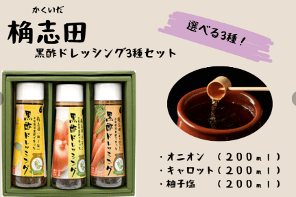 3年以上をかけて熟成させた黒酢を使用したドレッシング。オニオン、有機栽培の人参を使用したキャロット、柚子果汁の爽やかな香りと酸味が人気の柚子塩、3つの味が楽しめるギフトセットです。