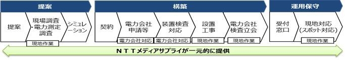 従来、マンションオーナー様が電子ブレーカーを導入する場合、マンション共有部に設置されている各低圧設備の電力測定等を通じ、適切な電子ブレーカーの選定や契約電力等のシミュレーションを実施する必要があります。また、電子ブレーカーの設置や契約変更には、電力会社との対応が必要となることから導入に手間が掛かっていました。これらの工程から導入後の運用保守までを、マンションオーナー様に代わりNTTメディアサプライがワンストップでサービス提供いたします。