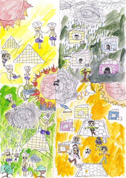 雨のところと晴れのところをこうかんするキカイ。雨がふらなくてこまっているさばくと、雨ばかりで外であそぶことができない子どもたちのいるところの天気をこうかんする。どっちもうれしくなるゆめのキカイ。