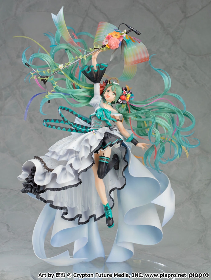 初音ミク10周年記念フィギュア企画としてたちあげた『初音ミク イラストコンテスト』より、大賞に輝いた作品「もっと高くまで!」(作:ぽむ)を、原型師・河原隆幸の手によって完全立体化。ファンの心を魅了し続けた「初音ミク」の“今までとこれから”を詰め込んだ特別なイラストを、その雰囲気を壊すことなくひとつひとつ丁寧に立体に落とし込み、沢山の心をこめて造形いたしました。身にまとったドレスと髪飾り、伸ばした手の先にあるマイクスタンドには、これまで彼女が歌いあげてきた数々の楽曲を連想させるようなモチーフが散りばめられています。大きくひろがった髪の毛にはクリアパーツを使用し、ボリュームがありつつも浮遊感のある絶妙な色合いに仕上げました。「もっと高くまで!」というタイトルの通り、希望に満ちた生き生きとした表情がとても魅力的です。キャラクターフィギュアの造形の限界に挑戦し、数ある「初音ミク」のフィギュアの中でもマスターピースとも言える作品に仕上がっておりますので、この機会に是非お手元にお迎えください。