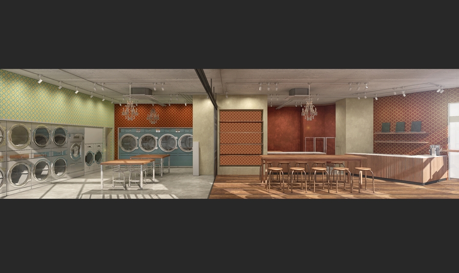 「デザインコンセプトはドイツのフレディ レック・ウォッシュサロン同様肩肘張らず、アットホームなイメージを再現しております。具体的には、光にこだわって本国同様のシャンデリアをメインの照明として使用した優しい光に包まれる空間づくりをしています。また、ランドリースペースの横にはカフェスペースを併設しシームレスな導線で一体感を作っています。洗濯機が回っている間の時間を過ごす人同士で会話が生まれ、地域の住民の方が雑貨やコーヒーを目当てにふらりと立ち寄れるような地域に開けたソーシャルな空間づくりを目指しています。」