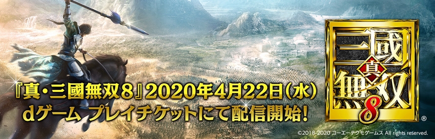 『真・三國無双8』クラウドゲーム 「dゲーム プレイチケット」にて2020年4月22日(水)配信開始!