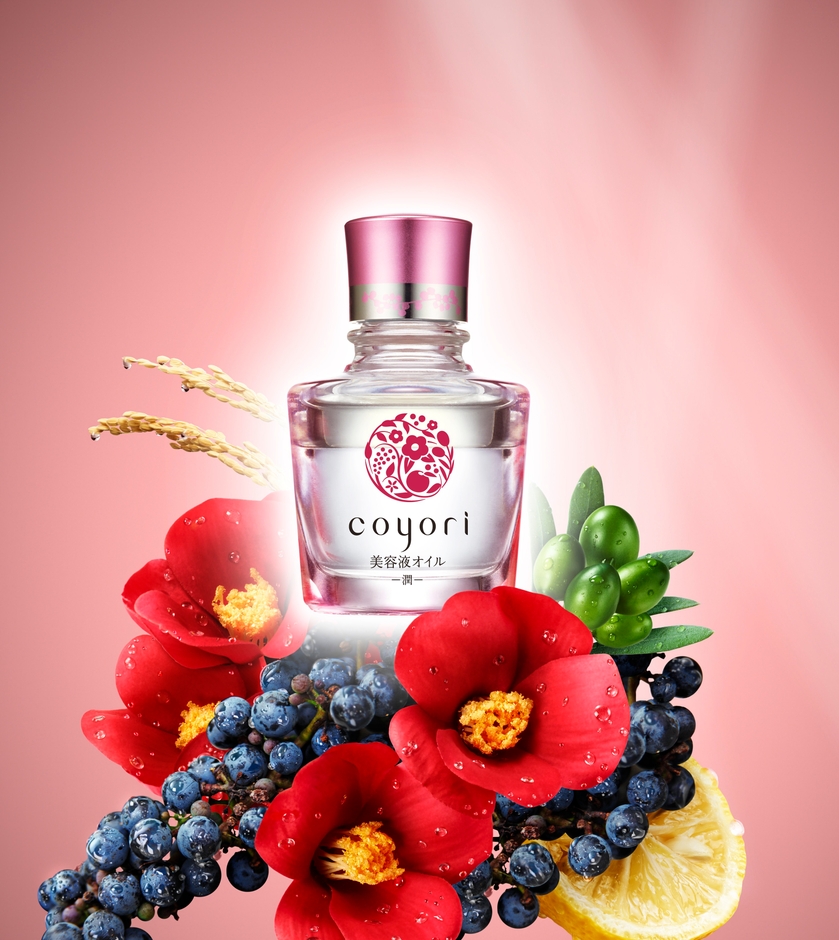今回の数量限定商品「Coyori 美容液オイル-潤-」では、ヤマブドウをイメージしたイラストをピンクゴールドの蓋に配置し、限定商品にふさわしい華やかさのある新容器を採用しています。