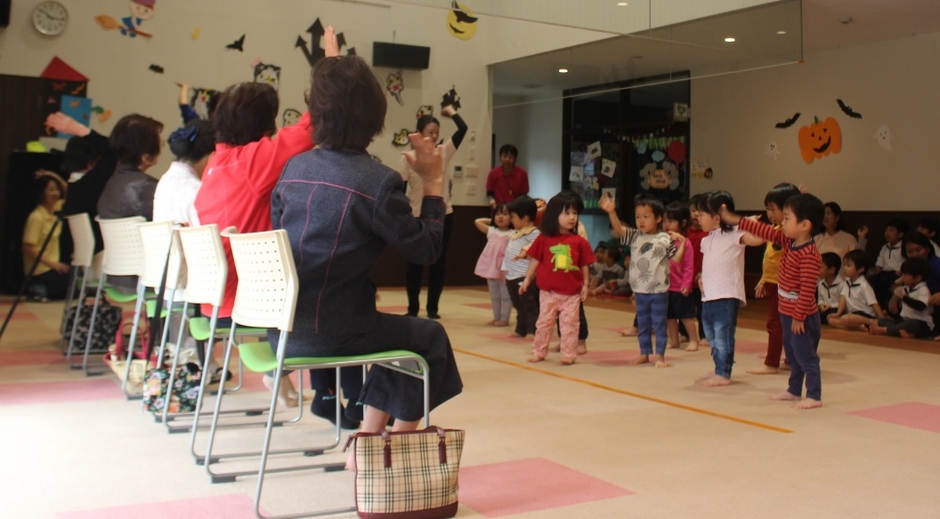御影インターナショナルこども園 地域老人会の方々との触れ合いの会を開催/園児が歌って踊り、和やかに交流
